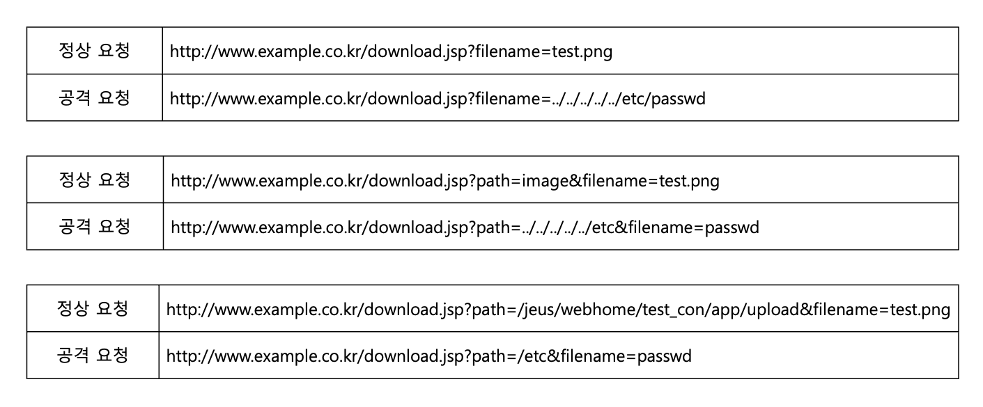- 웹 서버의 파일 시스템에 존재하는 파일을 다운로드하는 과정에서 파일의 경로를 임의로 조작하여 내부 자료를 다운로드 할 수 있는 취약점