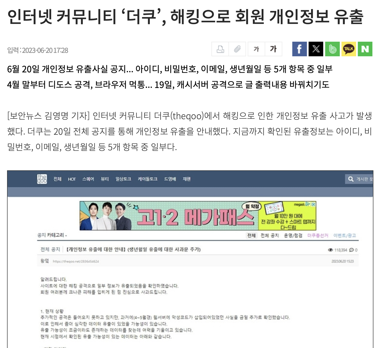 - 2023년 공개용 게시판 제로보드 기반의 커뮤니티 사이트가 웹쉘 공격을 받아 개인정보 유출