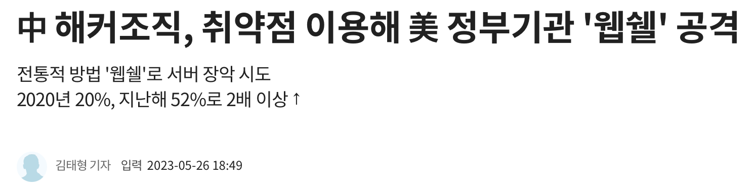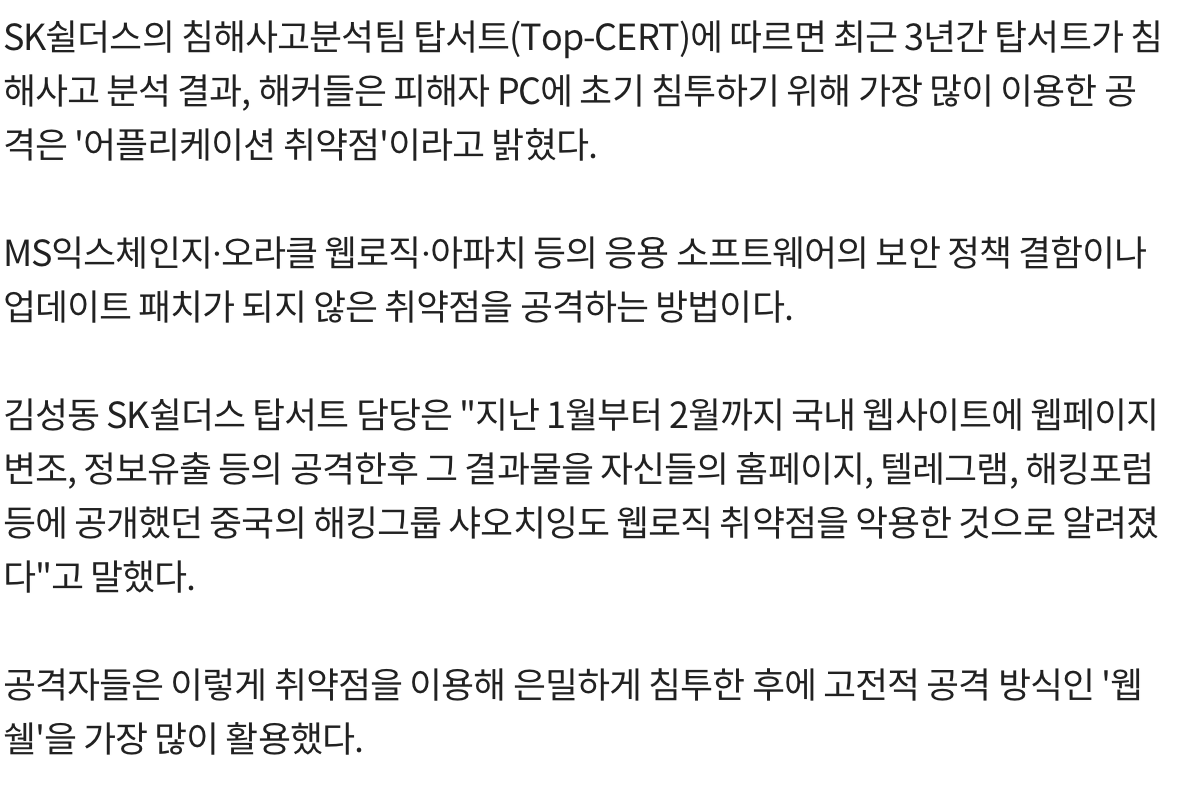- 외국 뿐만 아니라 우리나라에서도 어플리케이션 취약점을 통해 웹쉘 공격을 가장 많이함