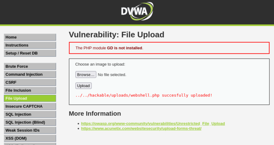 - DVWA 구성 후 파일업로드 취약점을 활용하여 웹쉘 업로드