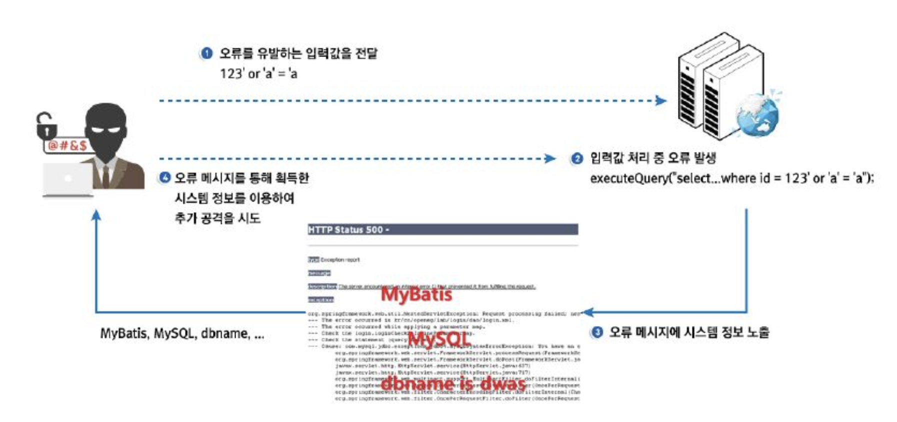 에러 처리를 충분히 하지 않아 에러 메시지를 통해 일반 사용자에게는 불필요한 정보가 보여지는 취약점