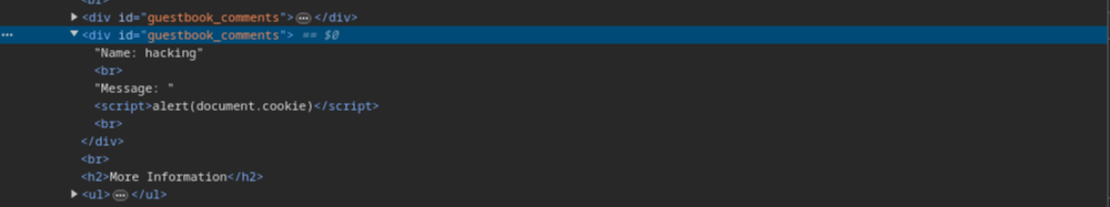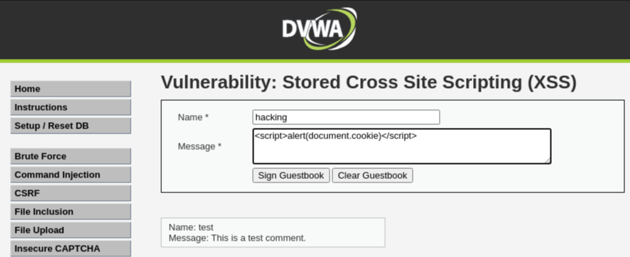 - DVWA 저장형 XSS 탭의 방명록 게시판