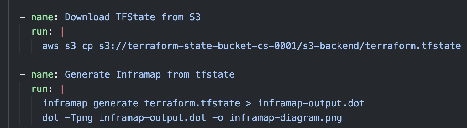- Go 언어와 Graphviz를 설치하여 GitHub Actions에서 Inframap을 구성하고, S3에 저장된 상태 파일을 불러와 시각화 자료를 생성 및 저장합니다